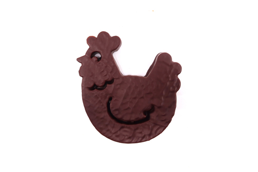 Une bouchée tendre et gourmande : Maman Poule cache un cœur fondant de praliné, oranges confites, enrobée de chocolat noir et lait.