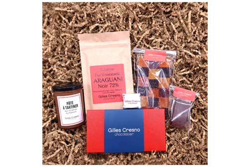Chaque coffret renferme une sélection raffinée de nos créations : pâte à tartiner, tablette Grand Cru, bouchée chocolatée, pâtes de fruits et bien d’autres douceurs.